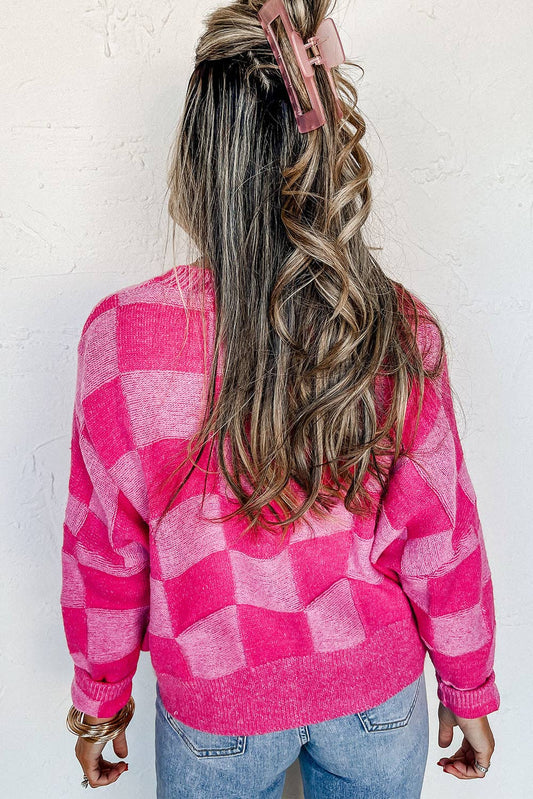 Pink Checkered Drop Shoulder Buttoned V Neck Cardigan